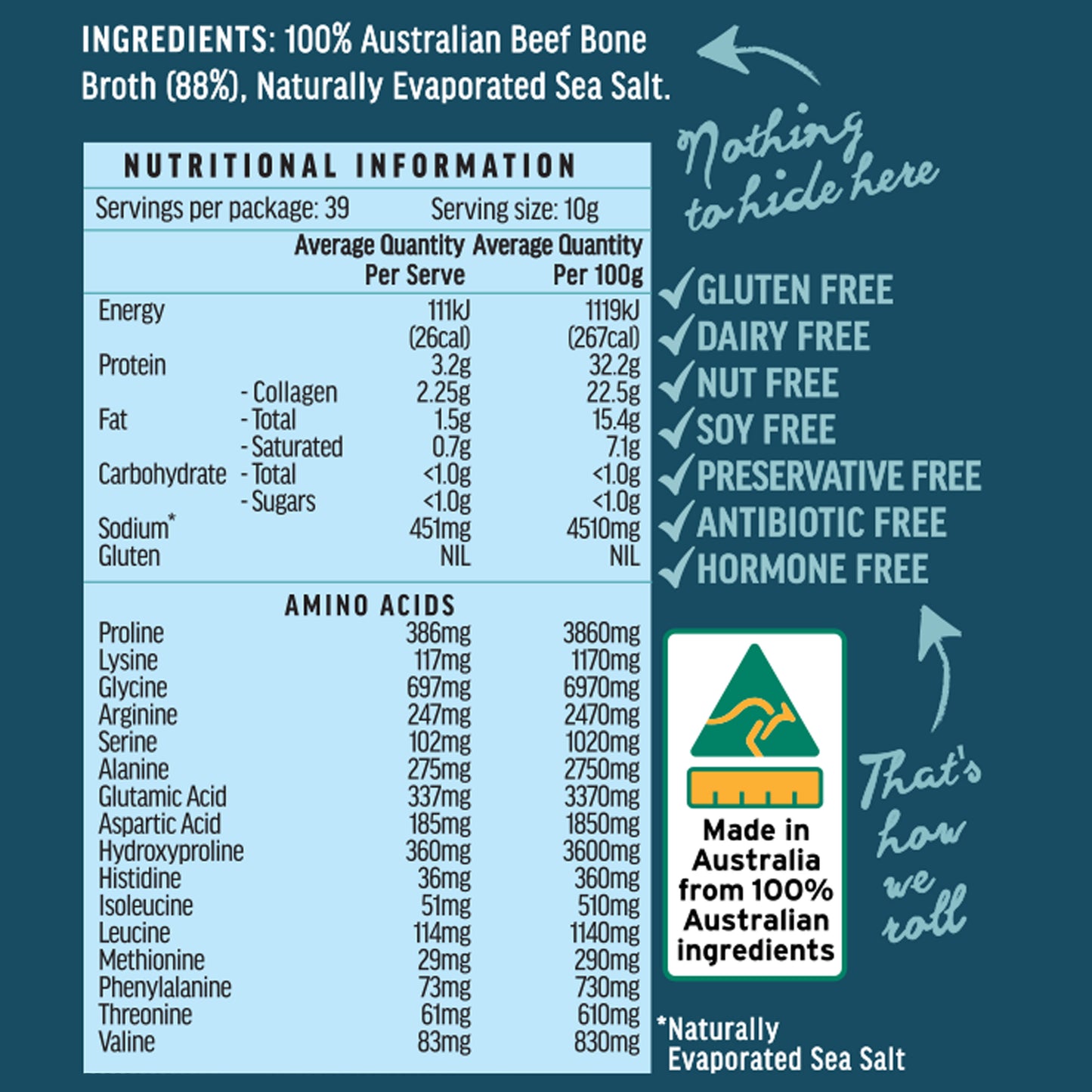 Ingredients: 100% Australian Beef Bone Broth (88%) Naturally Evaporated Sea Salt.