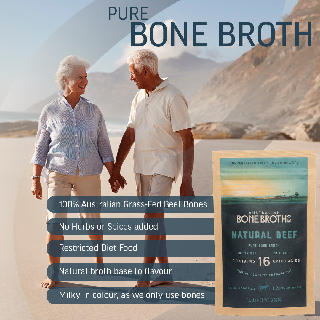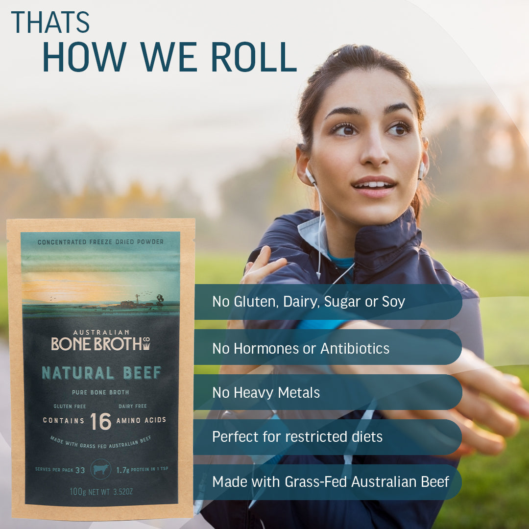 Bone broth on the go:  We have gone one step further and created a lightweight freeze-dried bone broth for you. Using our Australian Beef Bone Broth concentrated liquid which is made from the best grass-fed and finished beef bones and evaporated salt. We have gentle dried the bone broth ensuring all the valuable goodness is captured in this powder. NO other ingredients included. NO Veggies, NO Herbs. Just Pure Bone Broth.