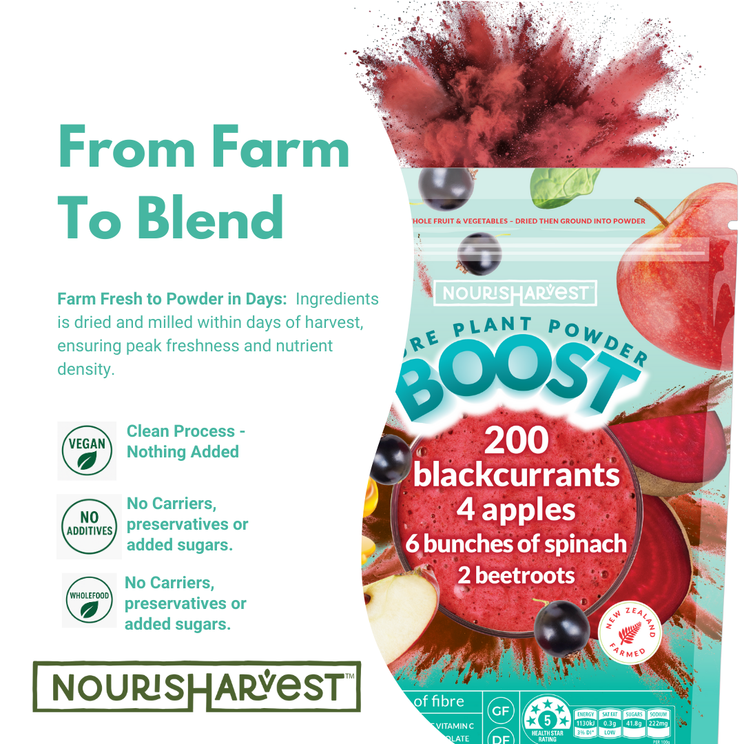 - β 100% Natural Wholefood β made from real blackcurrants, apples, spinach, and beetroot.