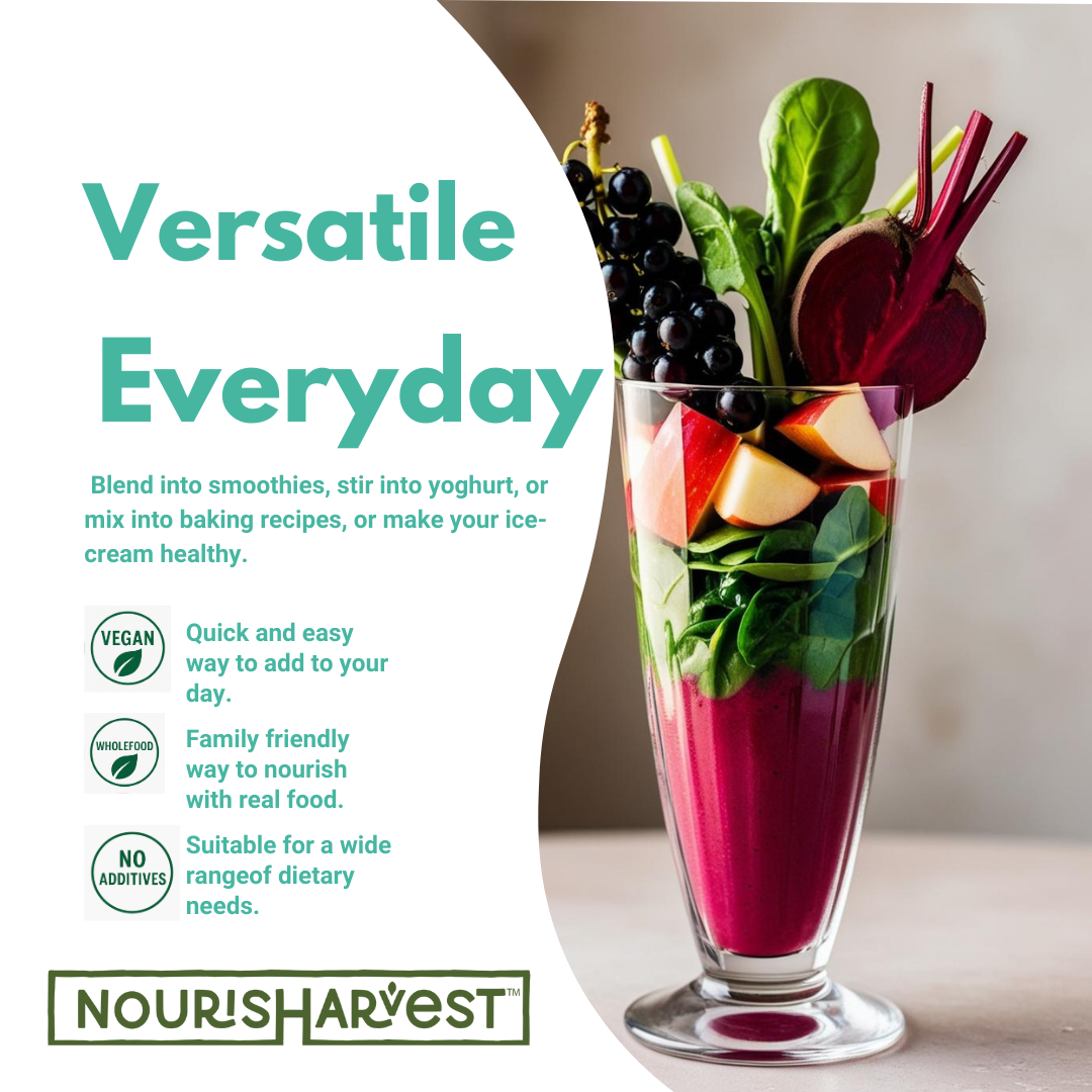 Boost your day with Nourisharvest Red Smoothie Powder β a 100% natural blend of blackcurrants, apples, spinach, and beetroot. Rich in antioxidants, vitamins and essential minerals, this nutrient-packed powder supports energy, immunity, and overall health.