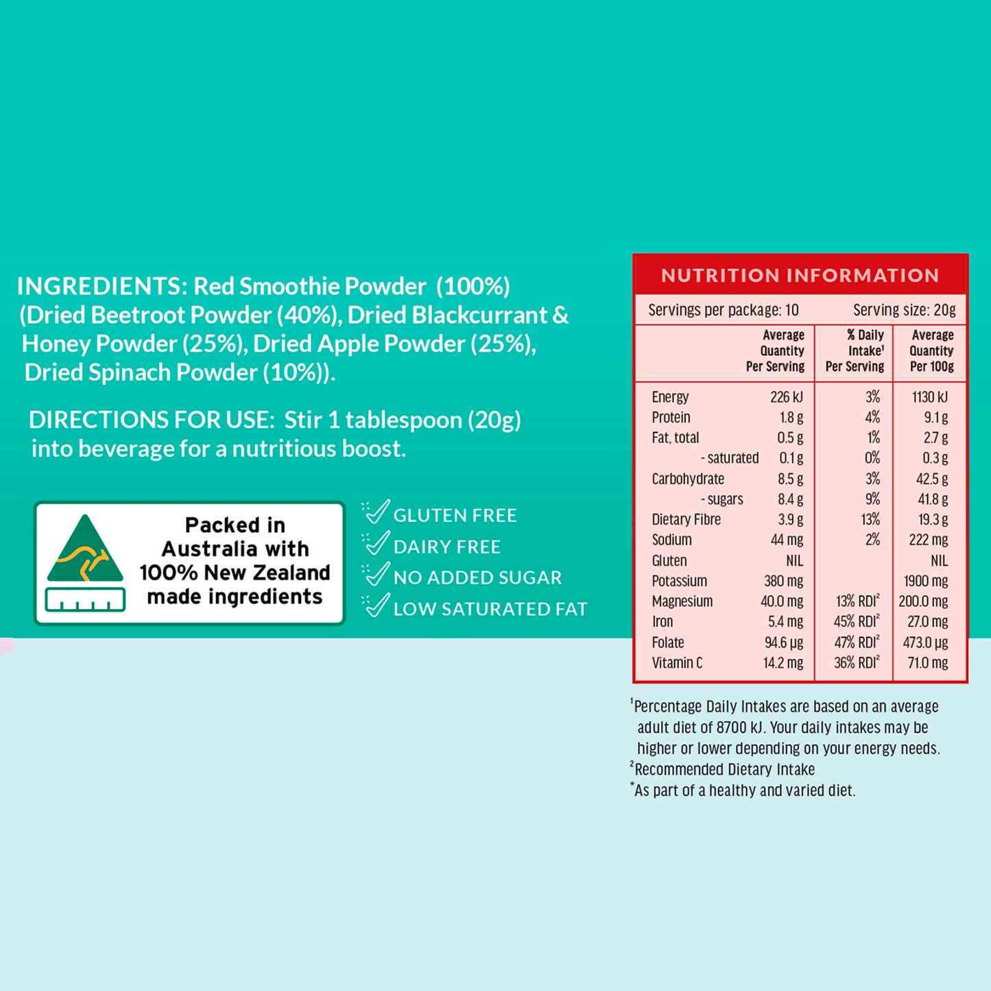 100% Red Smoothie Powder Blend: Beetroot Powder (40%), Blackcurrant & Honey Powder (25%), Apple Powder (25%), Spinach Powder (10%).